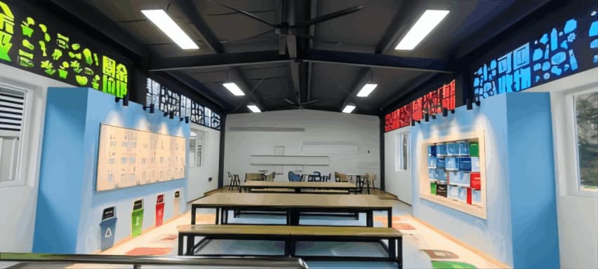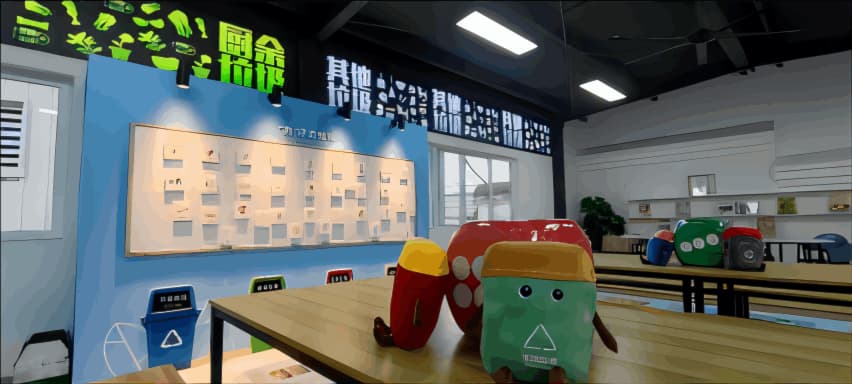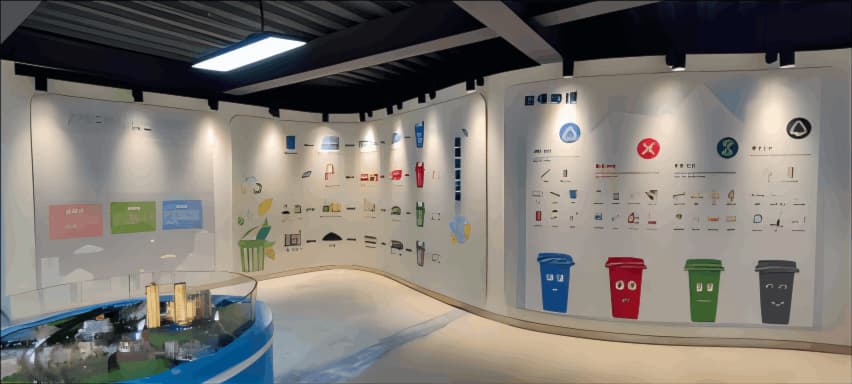 该项目是西南地区首个以科普教育为目的的分类知识展览项目,展馆面积约200平米,分为上下两层;一层规划为知识科普馆,主要用于科普垃圾分类基本知识,二层为活动体验馆,分为DIY展示区、手作区、休闲区。运用合理的布局打造合理的动线,划分功能区和展陈区,沉浸式将垃圾分类产品融入展陈,适当运用现代媒体技术,实现参观与互动融合。通过先进技术将垃圾分类过程、垃圾处理工程形象逼真,丰富有趣的展示出来。